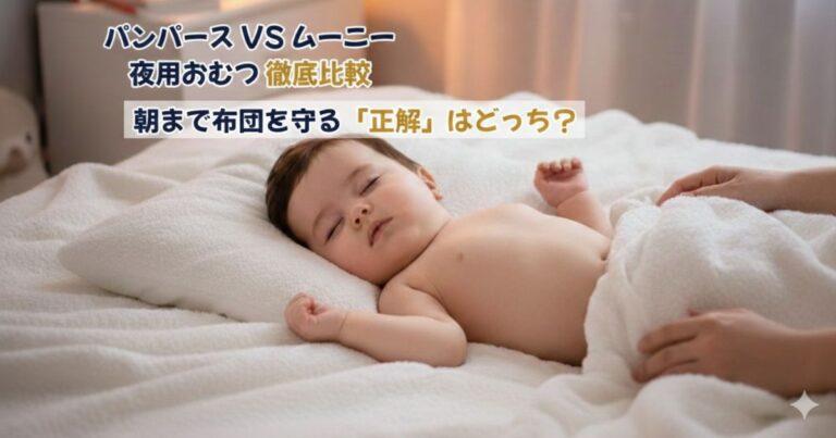 朝まで布団を濡らさないという目的は同じですが、パンパースはスリムで寝相対策に強く、ムーニーは圧倒的な吸収容量に特化しています。